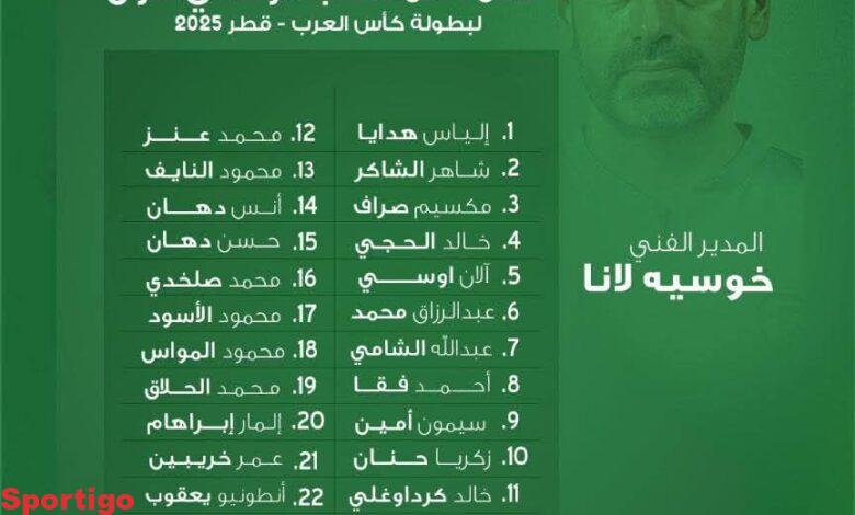 أعلن المدير الفني لمنتخب سورية، خوسيه لانا، القائمة النهائية لبطولة كأس العرب، وذلك وفق النظام المعتمد للبطولة الذي يفرض تسجيل 23 لاعباً فقط لمباراة الملحق ودور المجموعات….