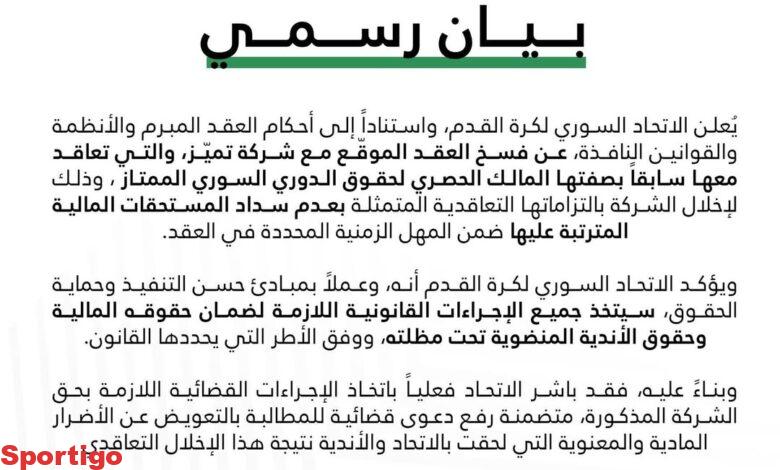 #الاتحاد #السوري #لكرة #القدم #يفسخ #العقد #مع #شركة #تميز #التي #تعاقد #معها #سابقا #بصفتها #المالك #الحصري #لحقوق #الدوري #الممتاز #وذلك #لإخلال #الشركة #بالتزاماتها #التعاقدية…