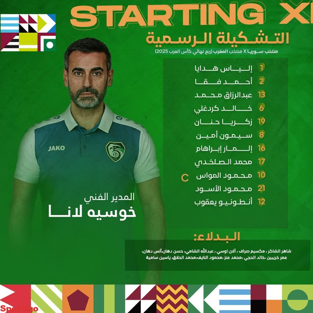 التشكيل الرسمي الذي اختاره المدير الفني للمنتخب الوطني لمواجهة المغرب في ربع نهائي كأس العرب – فيفا 2025، المباراة تبدأ في تمام الخامسة والنصف مساءً على استاد خليفة الدولي….