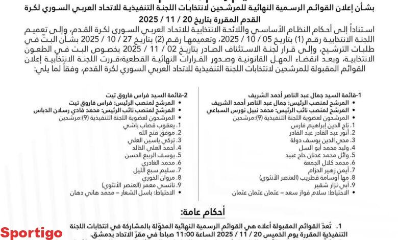 #تعميم #صادر #عن #اللجنة #الانتخابية #في #الاتحاد #العربي #السوري #لكرة #القدم #بشأن #إعلان #القوائم #الرسمية #النهائية #للمرشحين #لانتخابات #اللجنة #التنفيذية #للاتحاد #المقررة #بتاريخ #2025..
