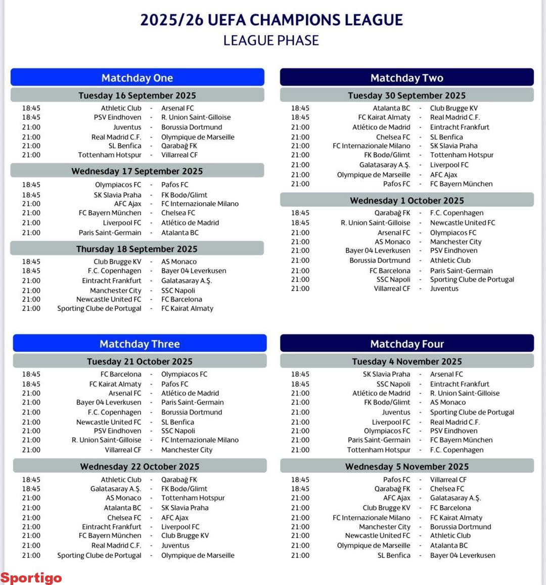 جدول مباريات الجولات الأربعة الأولى من #دوري_أبطال_أوروبا…