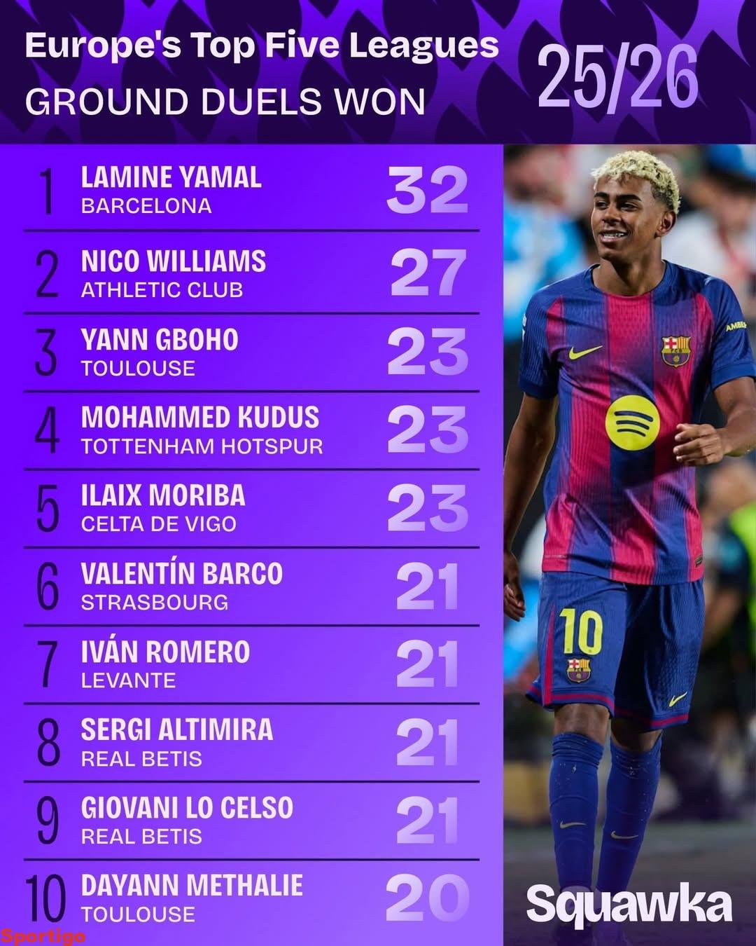 لامين يامال هو اللاعب الوحيد الذي فاز بأكثر من 30 مواجهة أرضية في الدوريات الخمس الكبرى في أوروبا في موسم 2025/26…