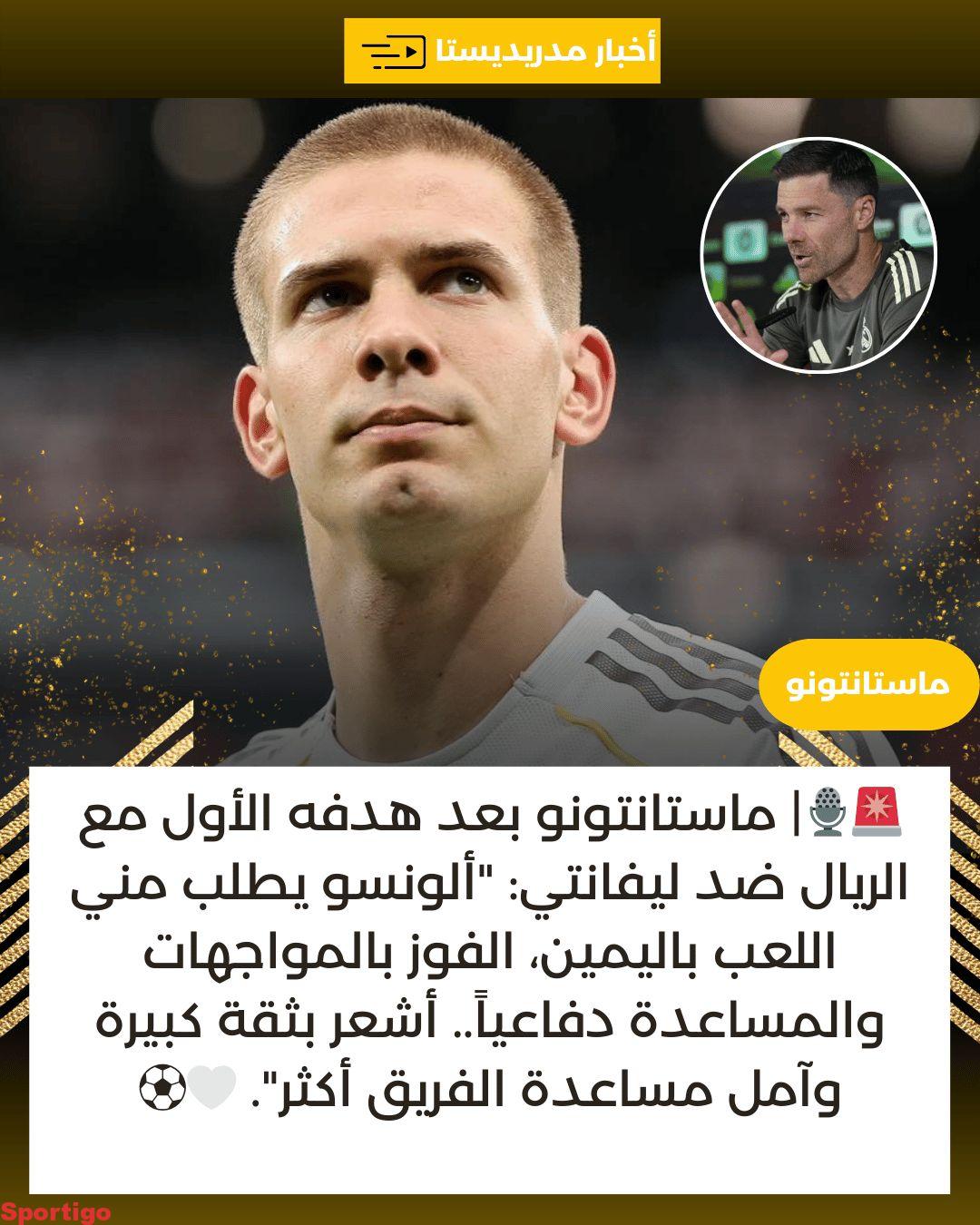 🔥⚪ | ماستانتونو بعد أول هدف له مع الريال: “ألونسو يطلب مني ألعب باليمين 💪 وأساعد دفاعياً 🛡.. واثق من نفسي ✨ وأريد مساعدة الفريق 👑⚽