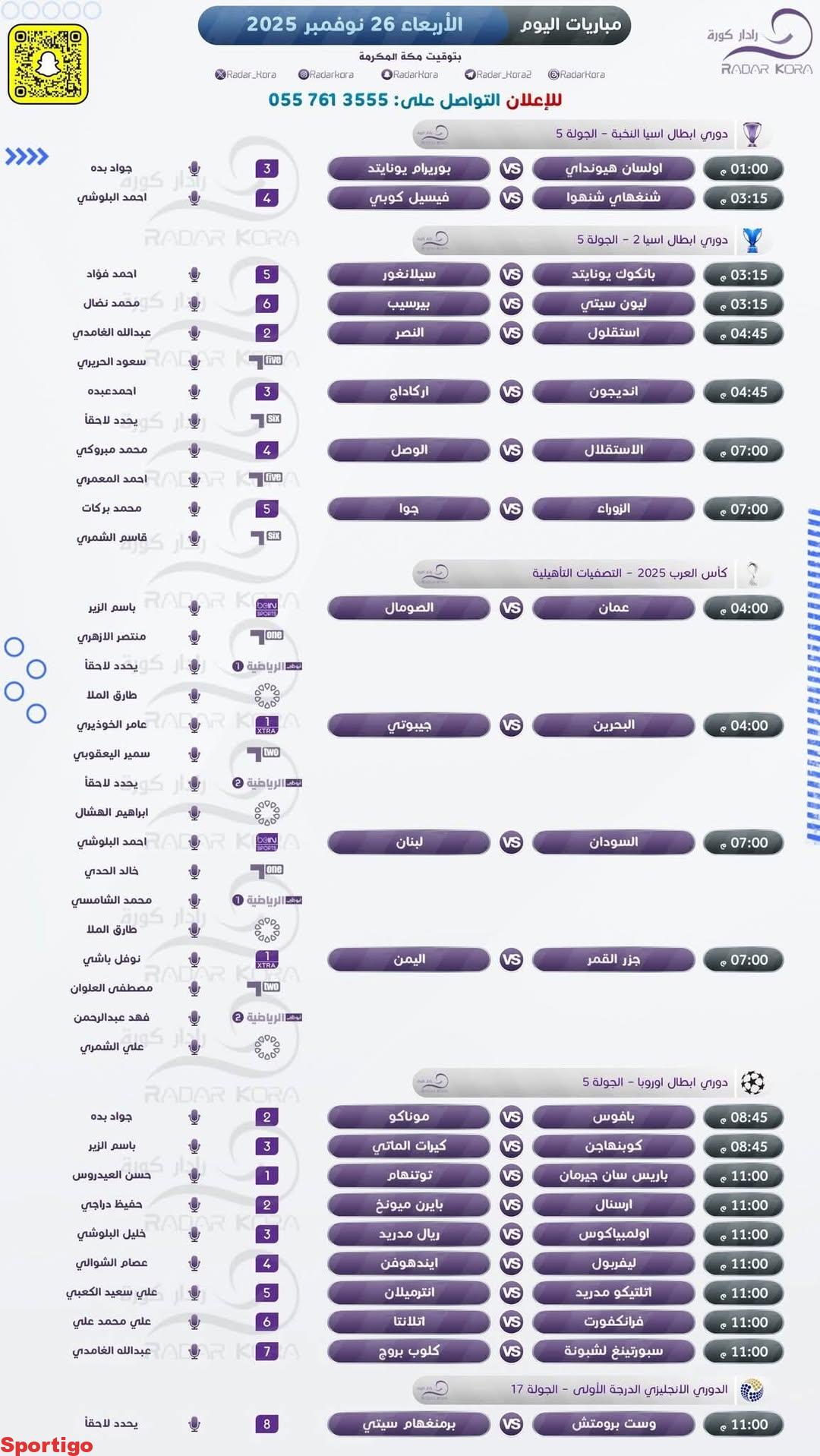 ⚽️ 🗓 | 26 نوفمبر #مباريات_الاربعاء #مباريات_اليوم..