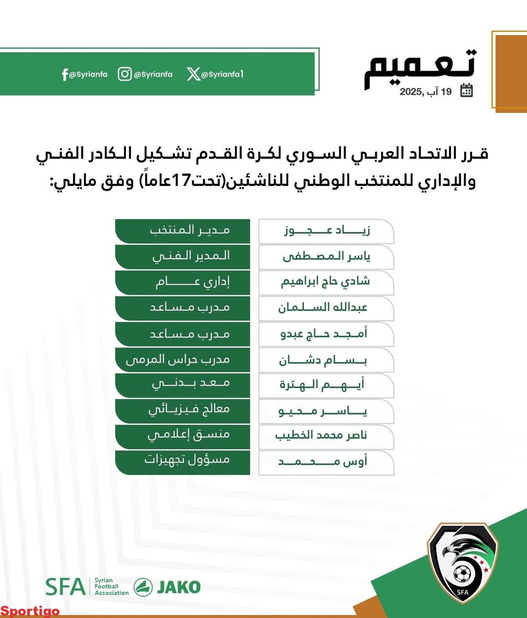 تشكيل الكادر الفني والإداري لمنتخبنا الوطني للناشئين تحت 17 عام. #ميعاد