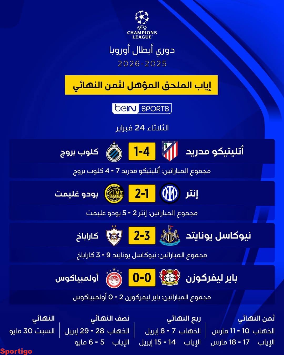 نتائج إياب الملحق المؤهل لثمن نهائي دوري أبطال أوروبا… semmou منذ ساعة واحدة #دوري_أبطال_أوروبا #نتائج #إياب #الملحق #المؤهل #لثمن #نهائي #دوري #أبطال #أوروبا.. مقالات ذات صلة كل مدريدي ينتظر عودة ايدر ميليتاو… باقي ليك ماتش و طلع لديفيزيون 1 الخصم لي كي طيح ضدك :… خبر عاجل لريال مدريد!… الكرامة يتعادل مع تشرين بهدف لهدف في ختام المرحلة التاسعة من الدوري السوري…